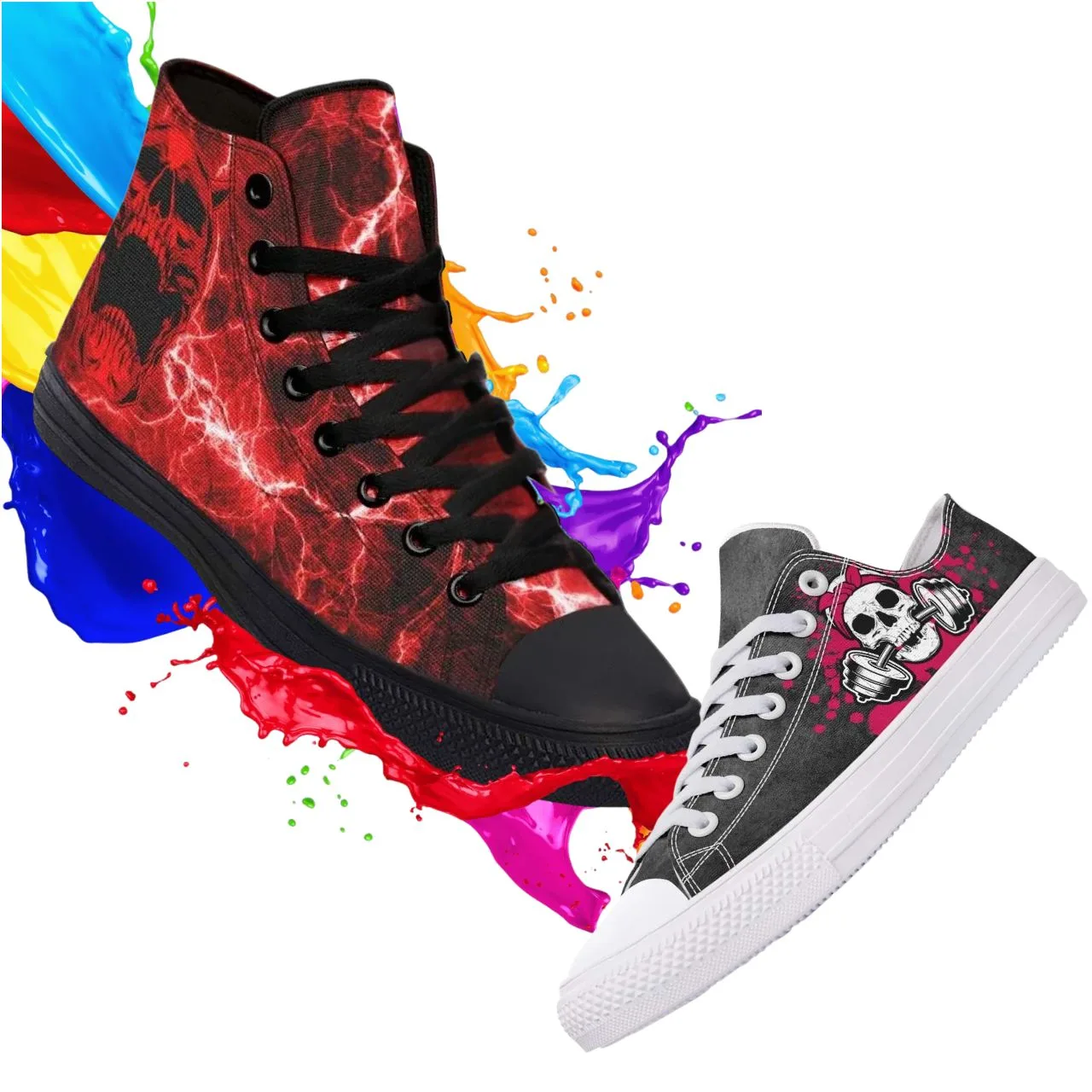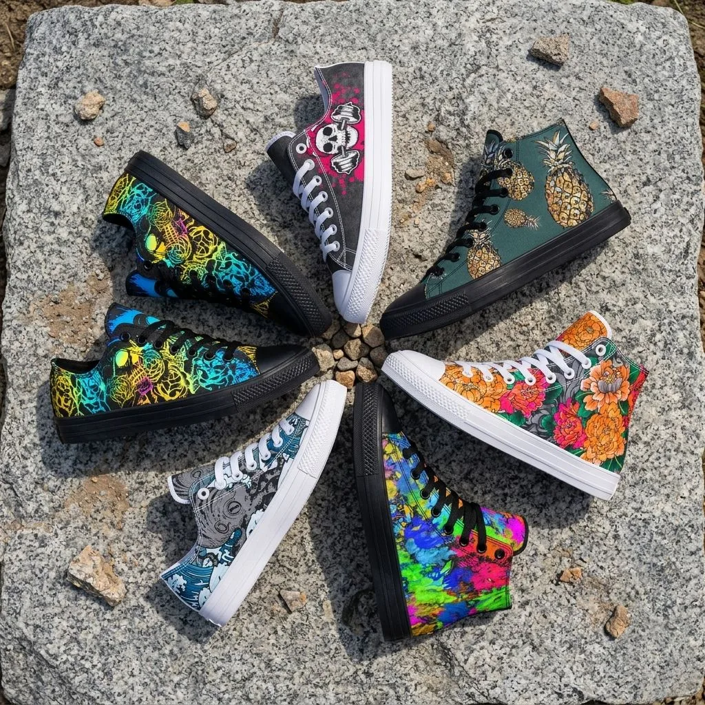 Diverse shoe styles: low top, high top, black sole, white sole. New designs with many unique patterns.