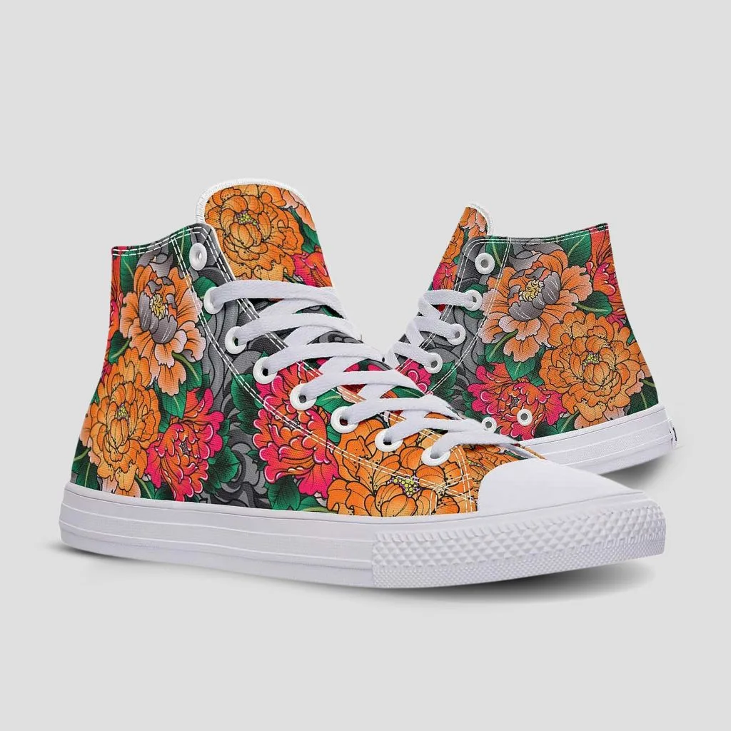 Peony Floral White High-Top Canvas Shoes with basic design, covered with eye-catching patterns. We hope this pair of shoes will bring comfort and fashion, suitable for both school, going out, or as a meaningful gift. The shoes are carefully selected from the sole material, lining, patterned canvas fabric to create softness but firmness, ventilation, bringing comfort. The pattern on the canvas is vivid, clear, durable, fade-resistant.