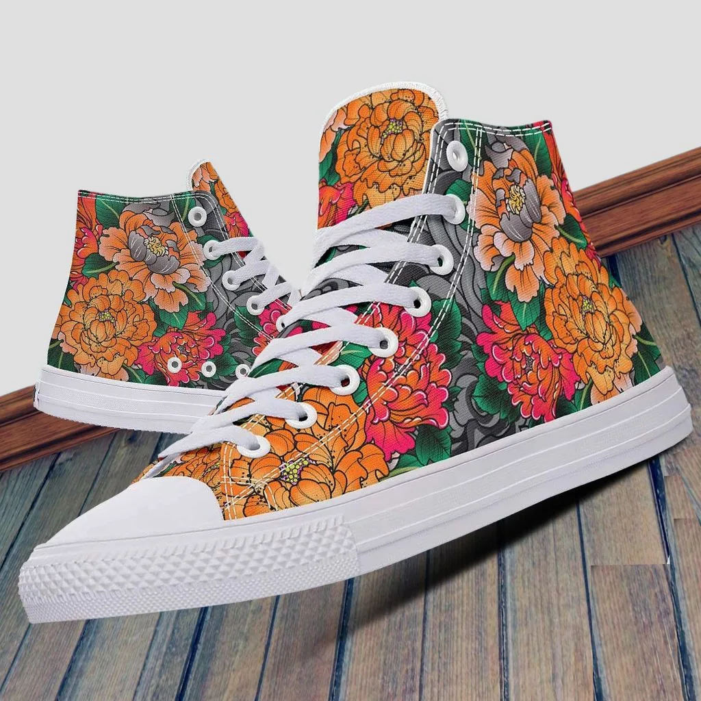Peony Floral White High-Top Canvas Shoes with basic design, covered with eye-catching patterns. We hope this pair of shoes will bring comfort and fashion, suitable for both school, going out, or as a meaningful gift. The shoes are carefully selected from the sole material, lining, patterned canvas fabric to create softness but firmness, ventilation, bringing comfort. The pattern on the canvas is vivid, clear, durable, fade-resistant.