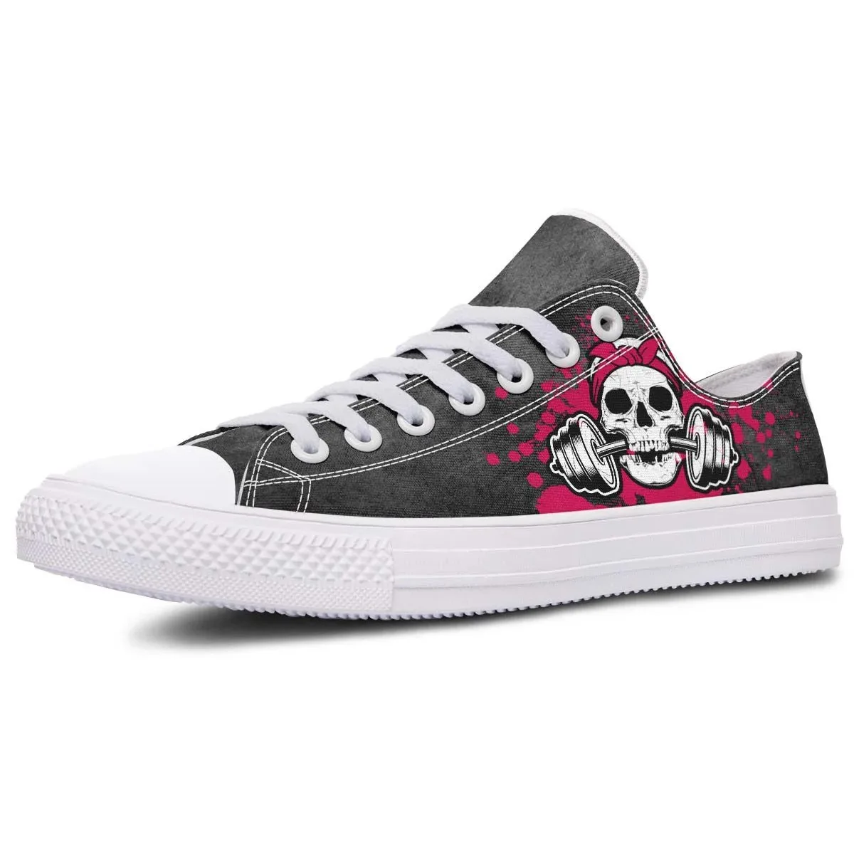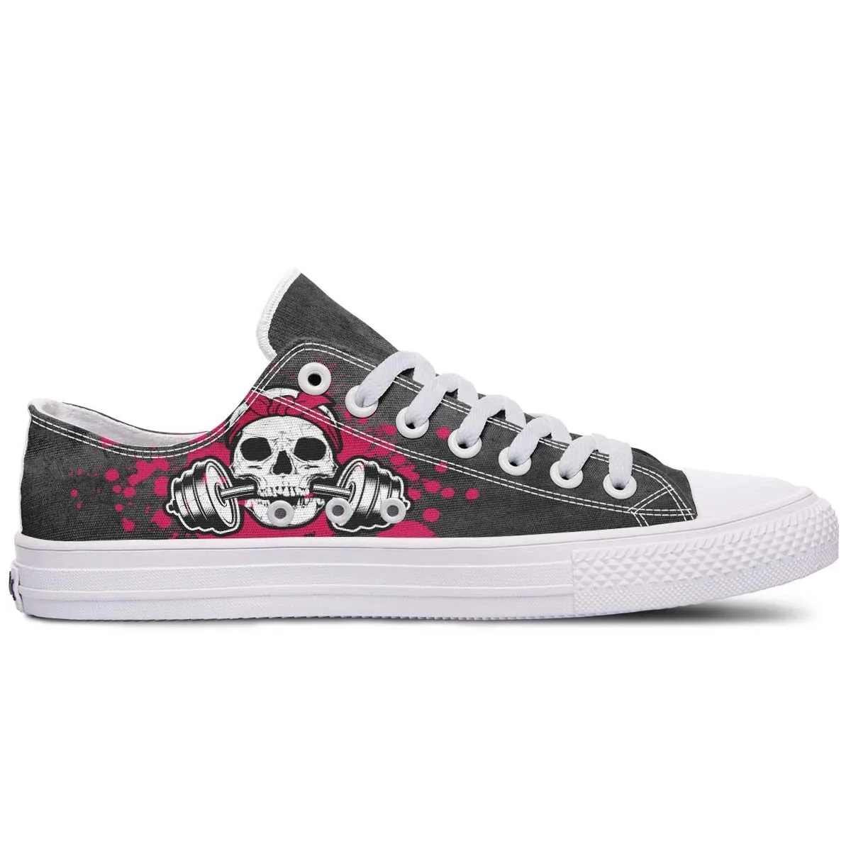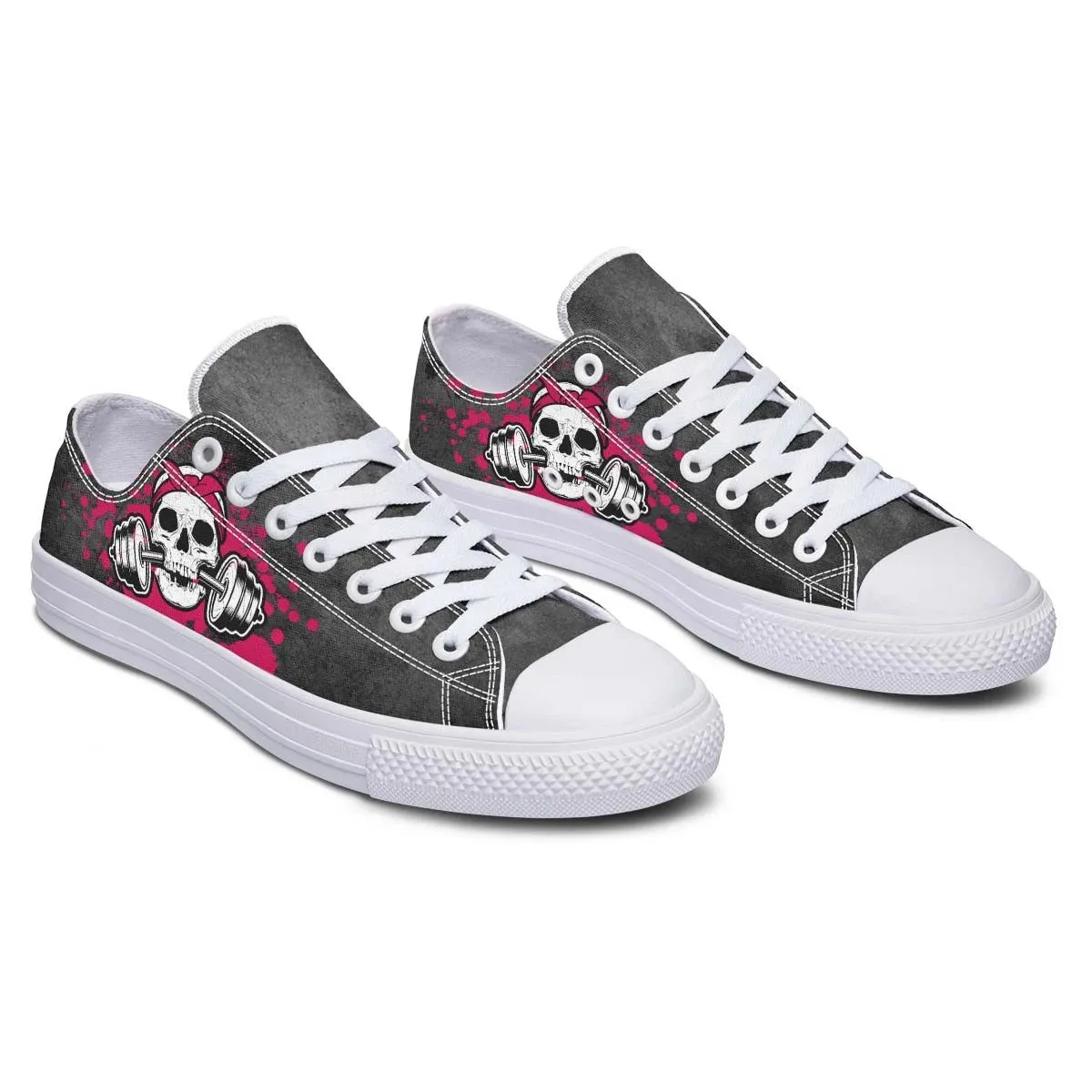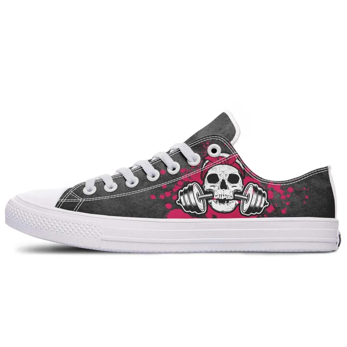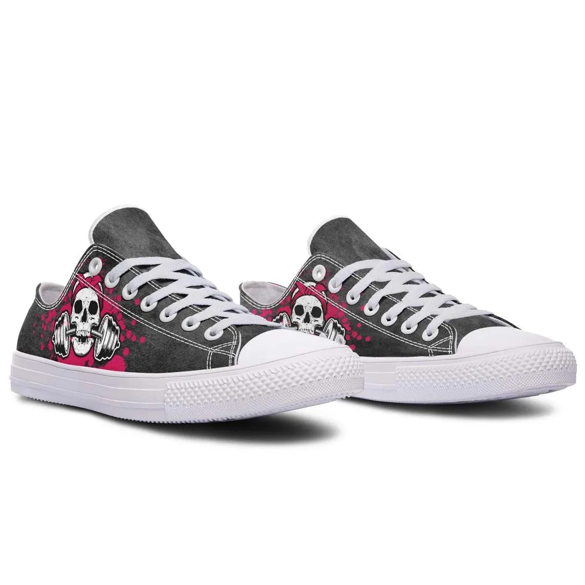 Pink Gym Skull Low-top Canvas Shoes with basic design, covered with eye-catching patterns. We hope this pair of shoes will bring comfort and fashion, suitable for both school, going out, or as a meaningful gift. The shoes are carefully selected from the sole material, lining, patterned canvas fabric to create softness but firmness, ventilation, bringing comfort. The pattern on the canvas is vivid, clear, durable, fade-resistant.
