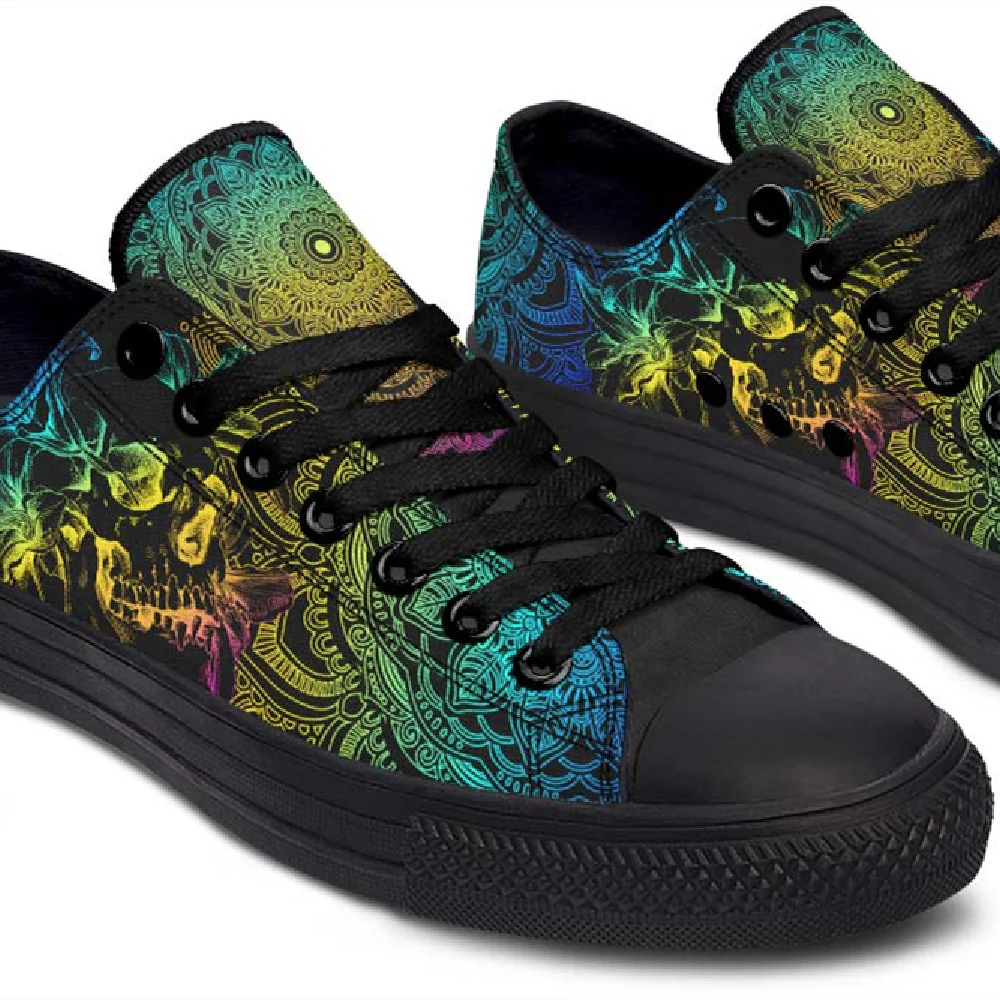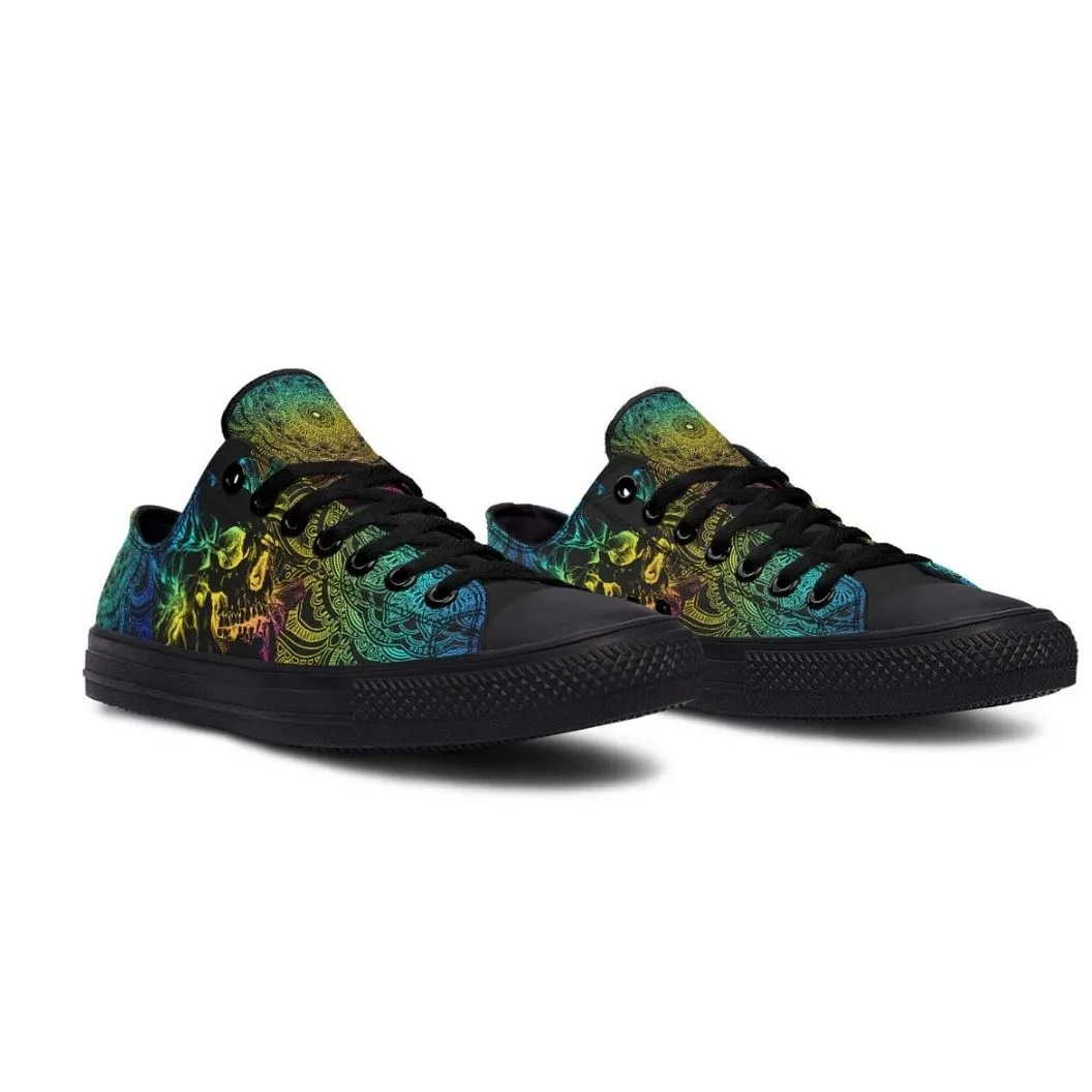 Psychedelic Skull Mandala Low Top Black Canvas Shoes with basic design, covered with eye-catching patterns. We hope this pair of shoes will bring comfort and fashion, suitable for both school, going out, or as a meaningful gift. The shoes are carefully selected from the sole material, lining, patterned canvas fabric to create softness but firmness, ventilation, bringing comfort. The pattern on the canvas is vivid, clear, durable, fade-resistant.
