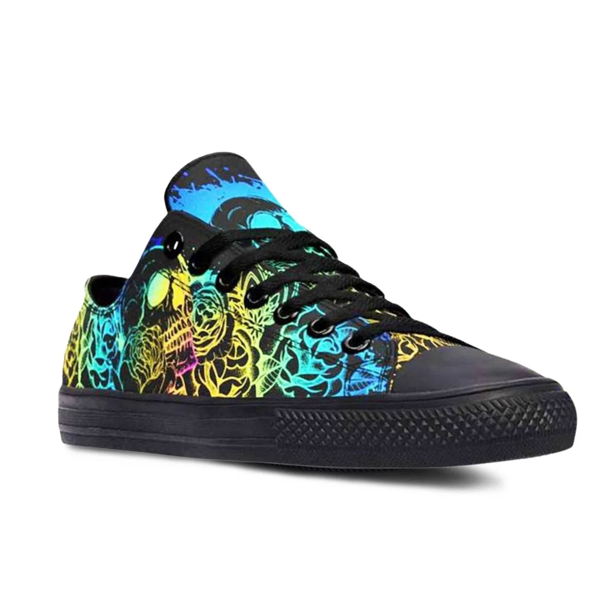- Upper: Sturdy canvas fabric with water-resistant properties, showcasing a vivid Psychedelic Skull Rose.