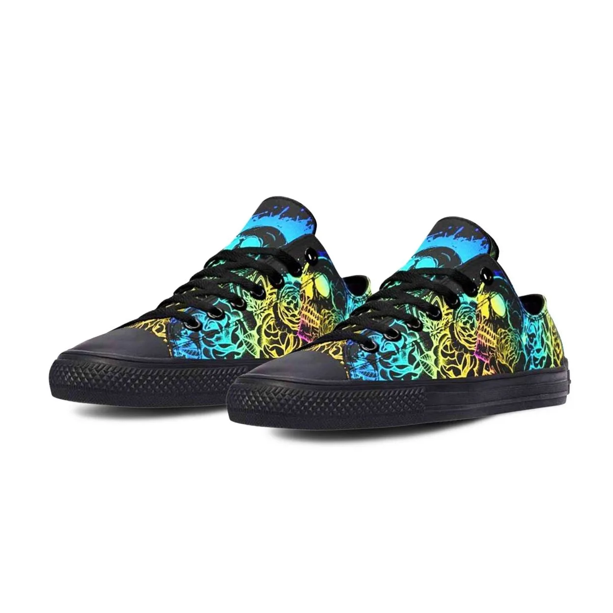 Psychedelic Skull Rose Low Top Black Canvas Shoes with basic design, covered with eye-catching patterns. We hope this pair of shoes will bring comfort and fashion, suitable for both school, going out, or as a meaningful gift. The shoes are carefully selected from the sole material, lining, patterned canvas fabric to create softness but firmness, ventilation, bringing comfort. The pattern on the canvas is vivid, clear, durable, fade-resistant.