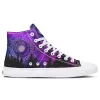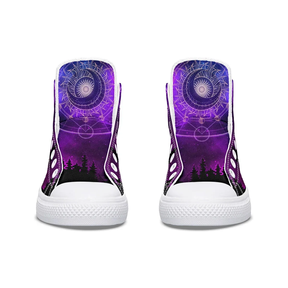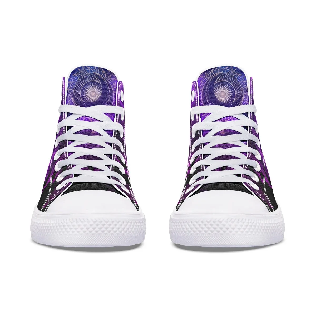 Purple Sun Moon High-Top Canvas Shoes with basic design, covered with eye-catching patterns. We hope this pair of shoes will bring comfort and fashion, suitable for both school, going out, or as a meaningful gift. The shoes are carefully selected from the sole material, lining, patterned canvas fabric to create softness but firmness, ventilation, bringing comfort. The pattern on the canvas is vivid, clear, durable, fade-resistant.