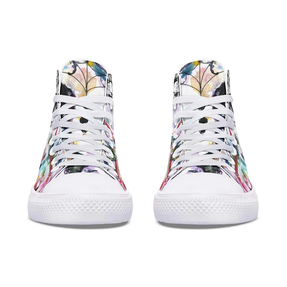 Rainbow Skull High-Top Canvas Shoes with basic design, covered with eye-catching patterns. We hope this pair of shoes will bring comfort and fashion, suitable for both school, going out, or as a meaningful gift. The shoes are carefully selected from the sole material, lining, patterned canvas fabric to create softness but firmness, ventilation, bringing comfort. The pattern on the canvas is vivid, clear, durable, fade-resistant.