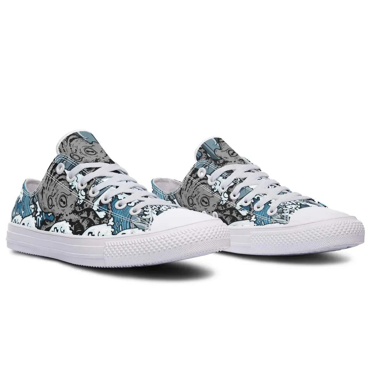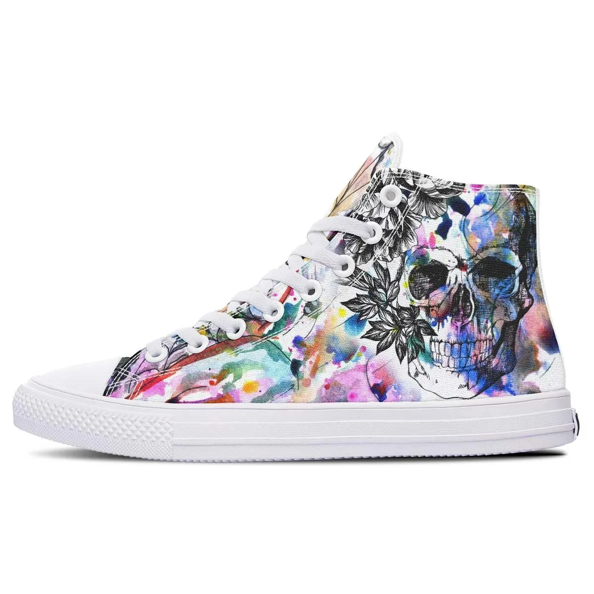 - Upper: Sturdy canvas fabric with water-resistant properties, showcasing a vivid Rainbow Skull.
