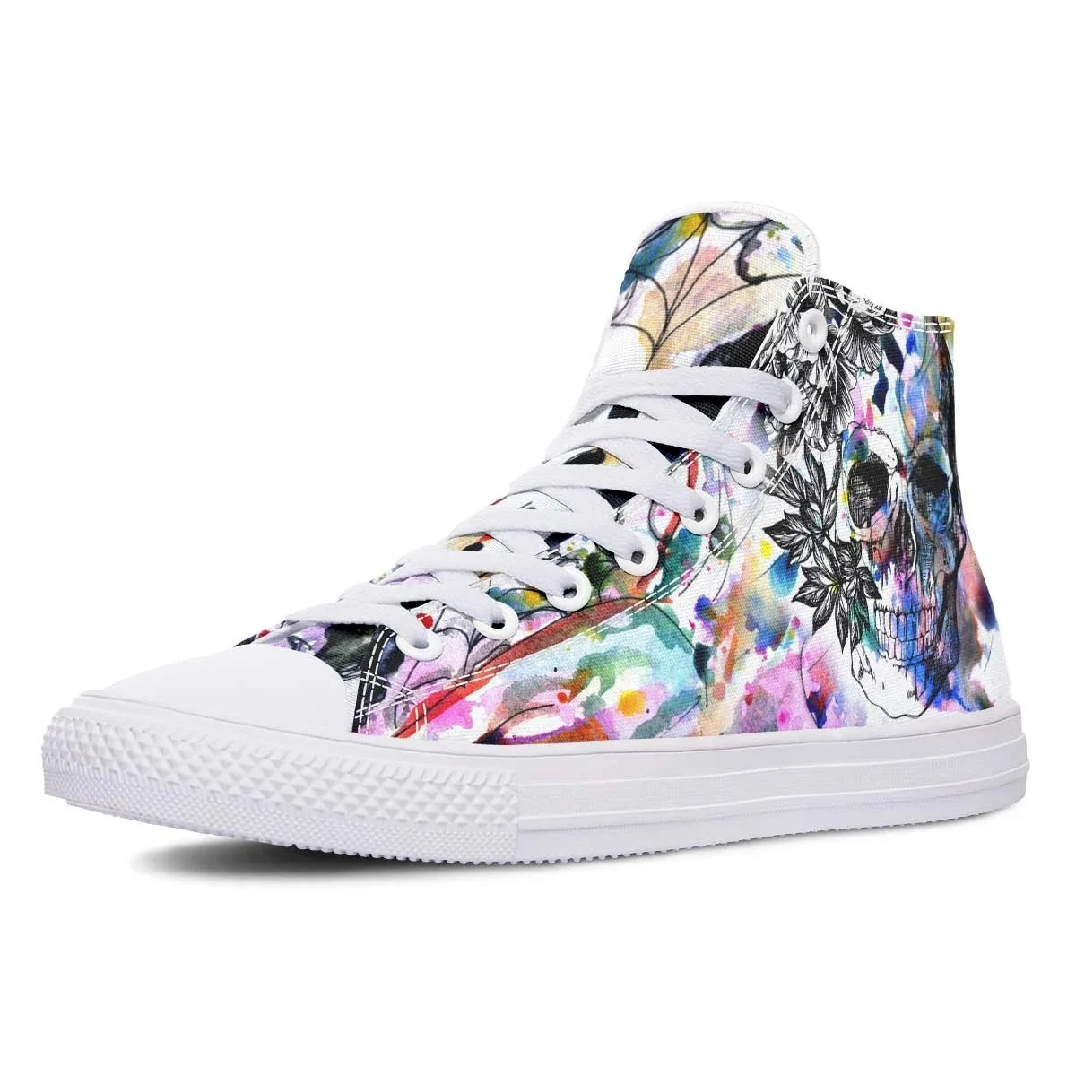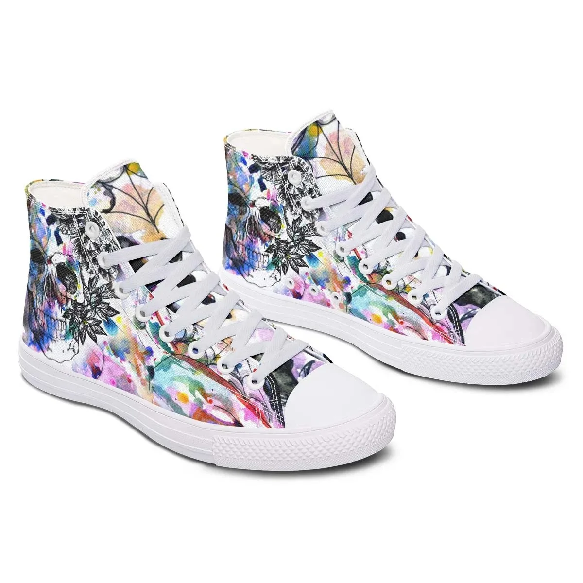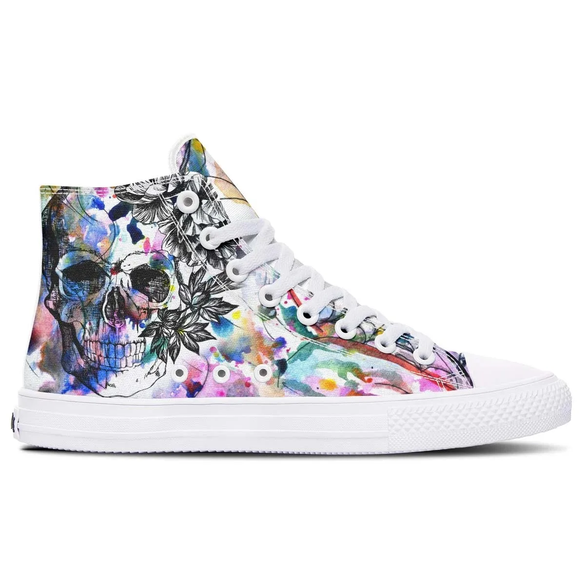 - Upper: Sturdy canvas fabric with water-resistant properties, showcasing a vivid Rainbow Skull.