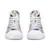 Rainbow Skull High-Top Canvas Shoes with basic design, covered with eye-catching patterns. We hope this pair of shoes will bring comfort and fashion, suitable for both school, going out, or as a meaningful gift. The shoes are carefully selected from the sole material, lining, patterned canvas fabric to create softness but firmness, ventilation, bringing comfort. The pattern on the canvas is vivid, clear, durable, fade-resistant.